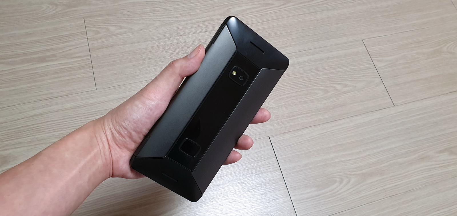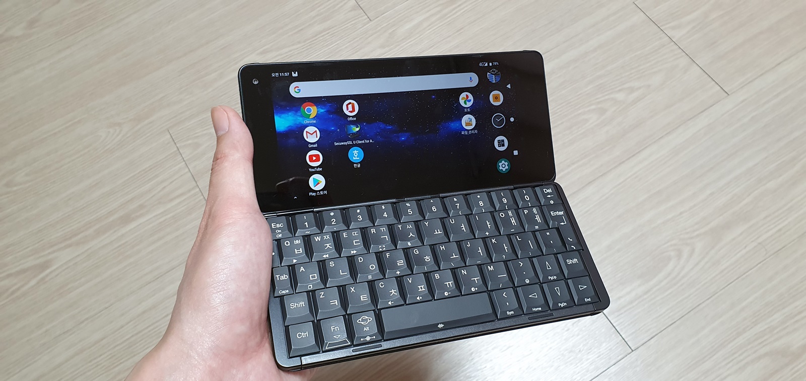 노트북과 같은 형태로 이렇게 펼치면 5.99인치 메인 화면과 물리 키보드를 볼 수 있다오.