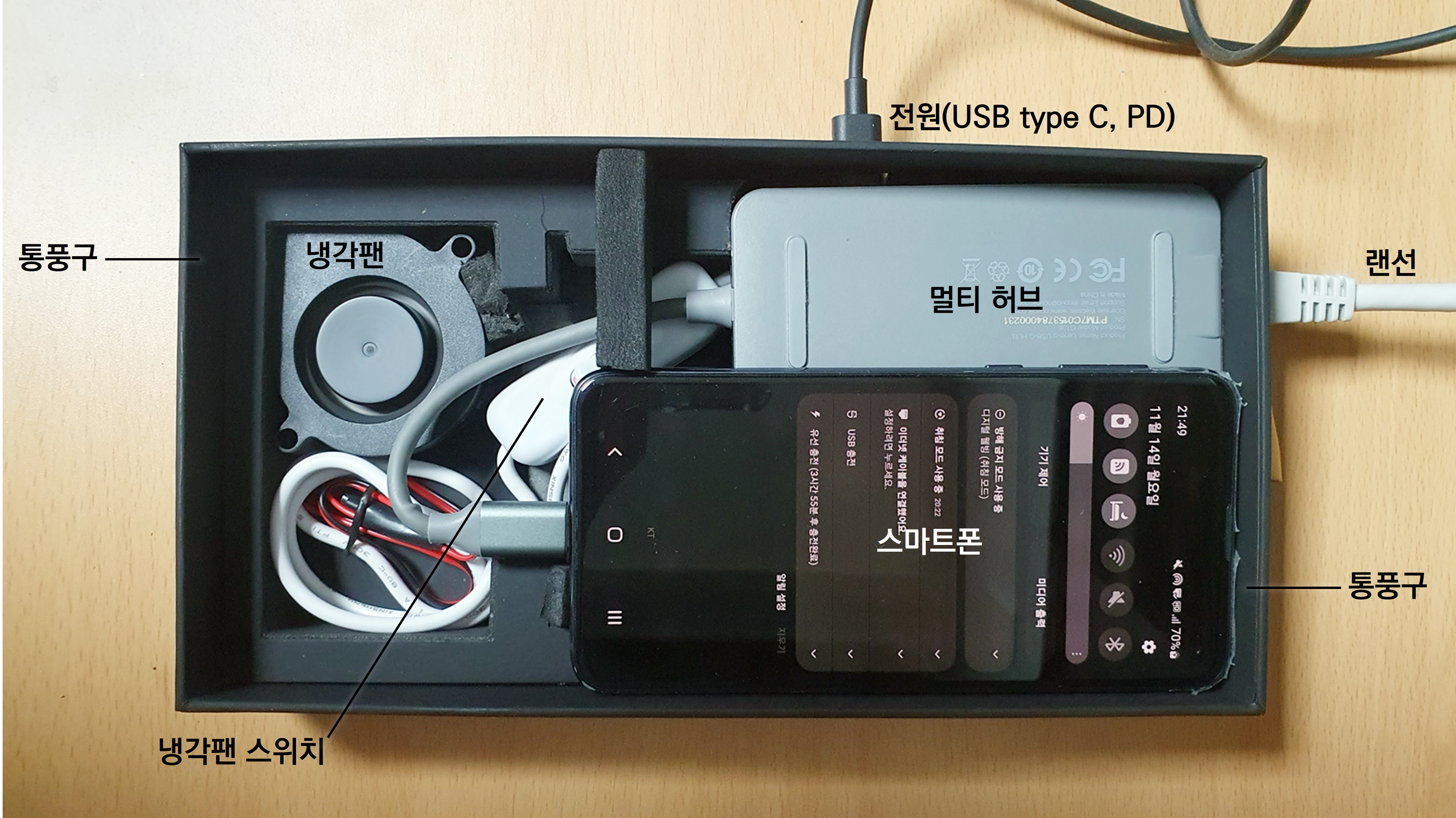냉각팬이 없으면 스마트폰과 멀티 허브의 발열로 인해 얼마 가지 않아 작동 불능 상태가 되므로 냉각팬은 필수이되, 지름 5cm 이하의 조그마한 팬으로도 충분하오.