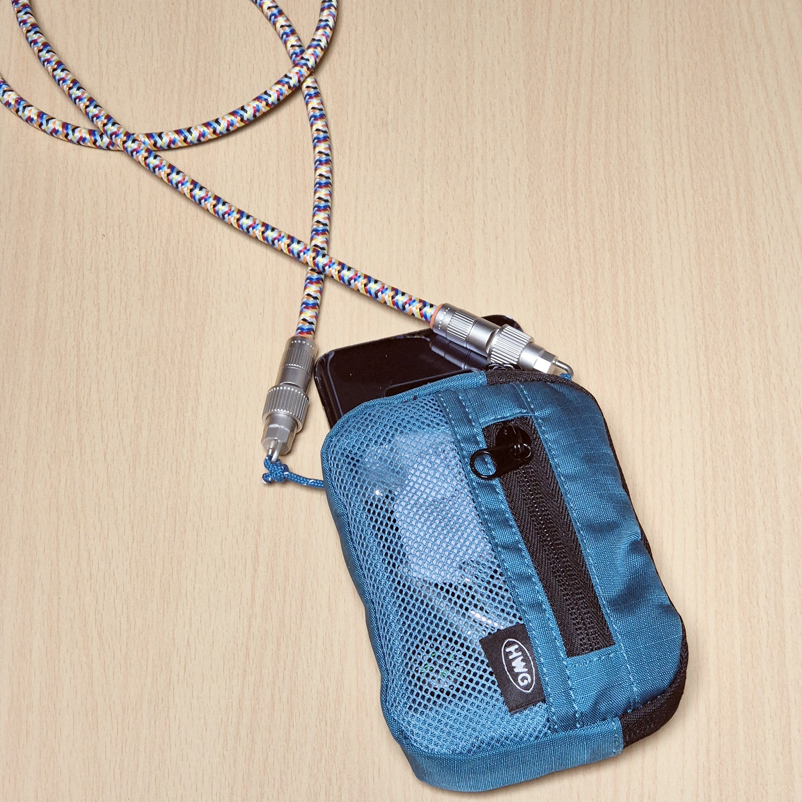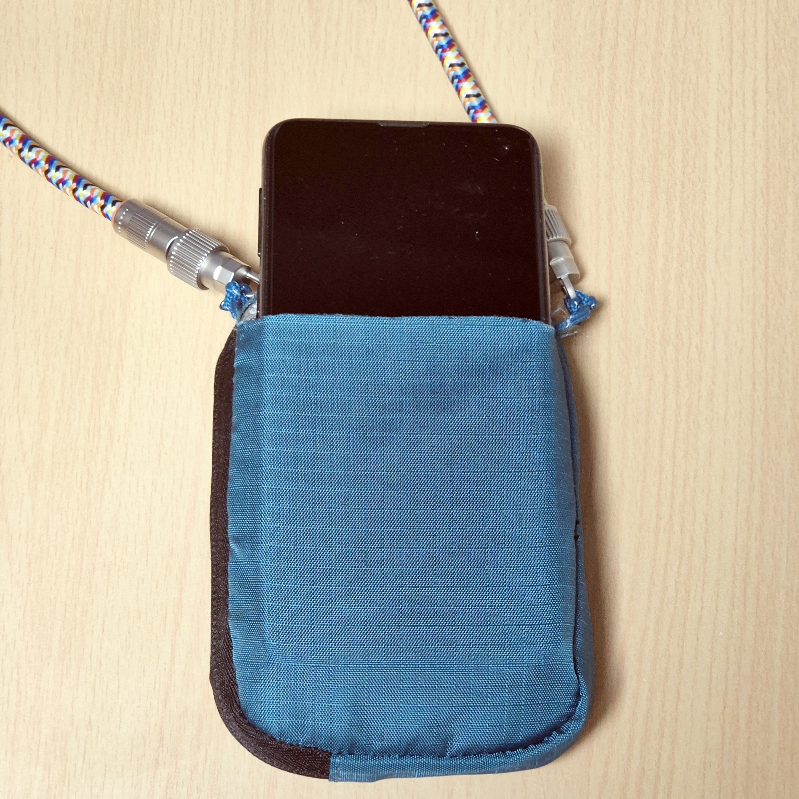 지갑에 이미 D형 고리가 하나 달려 있으나, 그것만 쓰면 스마트폰 수납이 걸리적거리고 착용감이 불편하므로 이렇게 손을 봤소.
