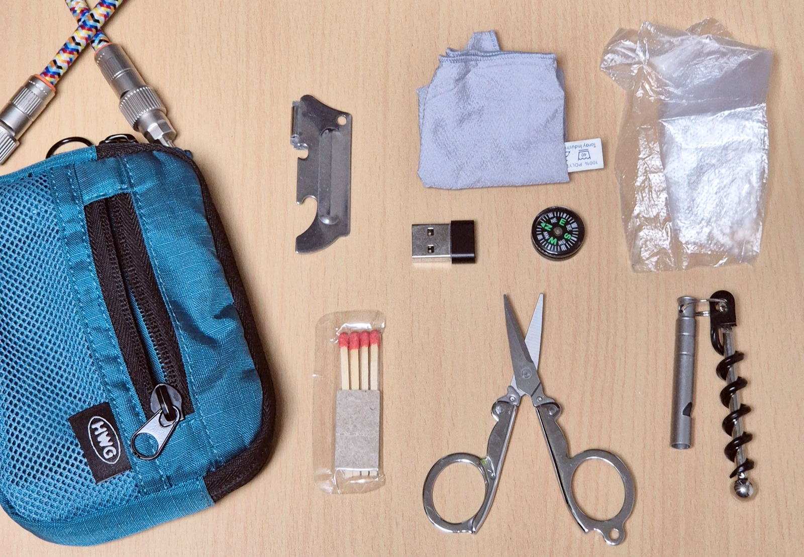 - 방수 처리한 성냥: 불 피우는 도구로는 라이터가 가장 편리하겠으나, 이 작은 지갑에는 라이터 넣기도 버거우므로 부피를 극단적으로 줄일 수 있는 성냥을 채택했소. 몸에 지니는 성냥은 기내 반입에 문제가 없소.
